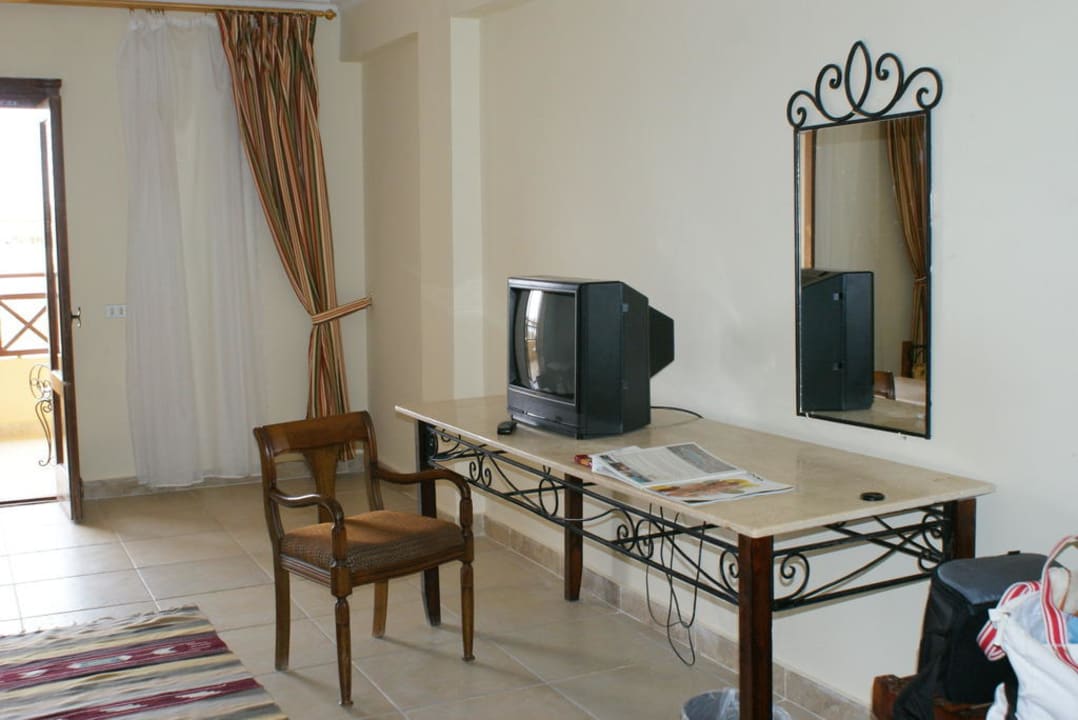 der "Schreibtisch" mit Fernseher und einem Stuhl + Zimmerspiegel