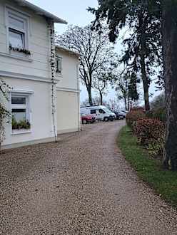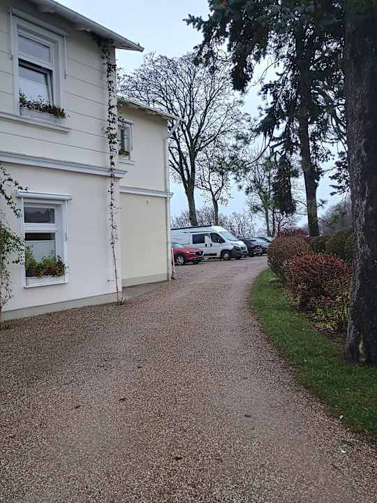 Blick vom Eingang des Haupthauses zum hinteren Parkplatz