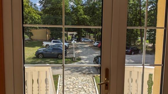 Blick aus dem Haupthaus Richtung "Bistro" an der Str.