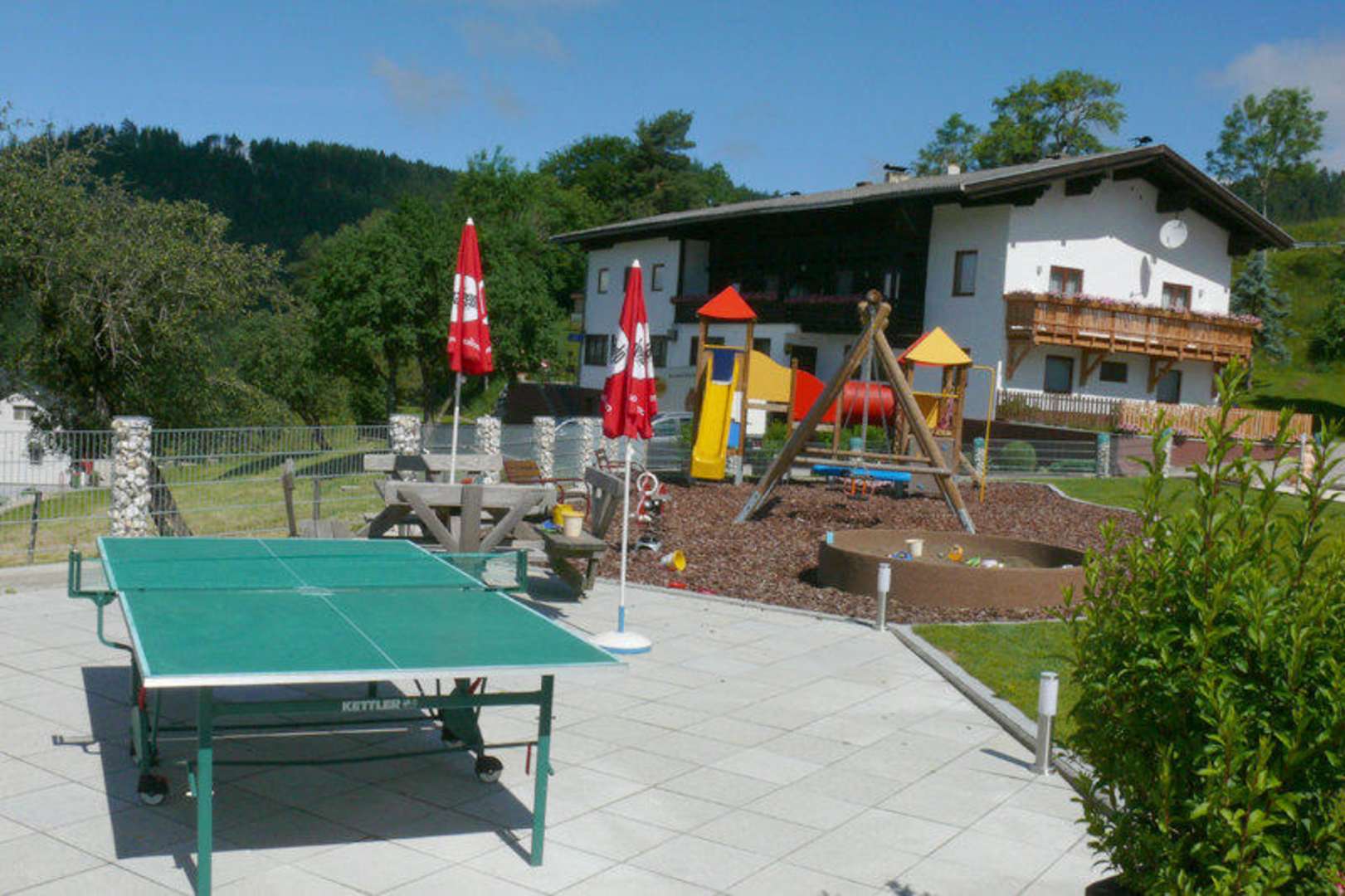 Blick vom Wellnessbereich zum Haupthaus