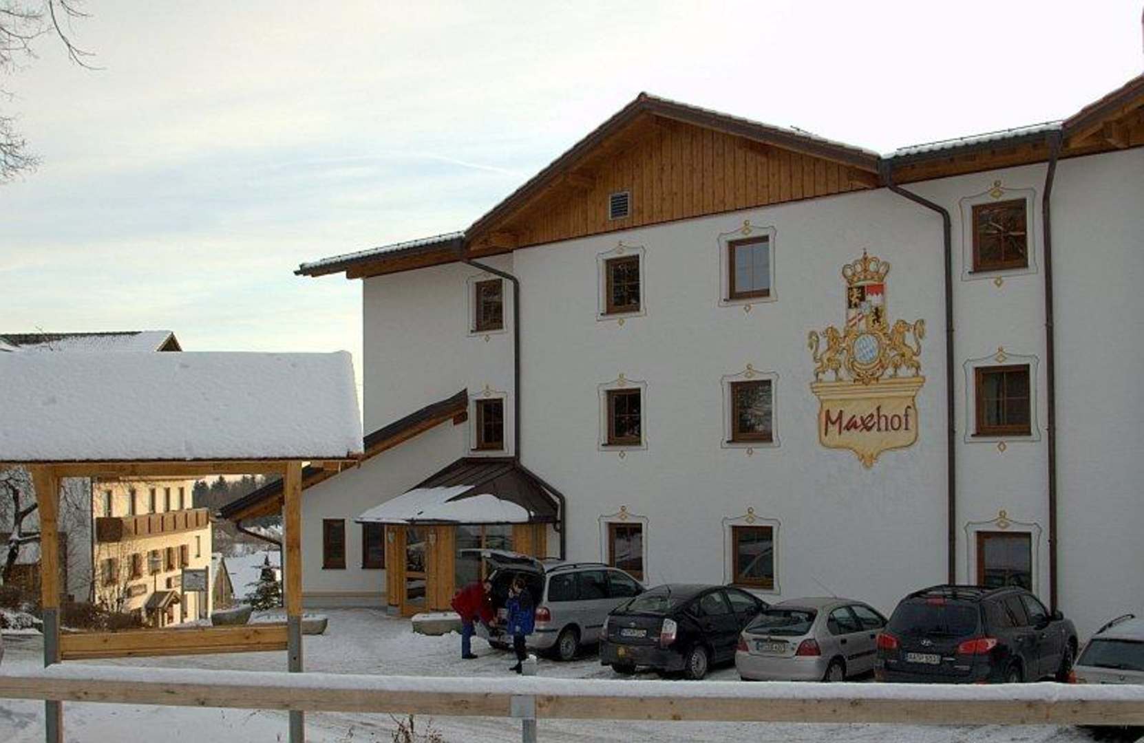 Maxhof Aussen 2Hier kann man links unterhalb dass Stammhaus erkennen; dort ist Metzgerei, Restaurant (auch Frühstück, etc.)