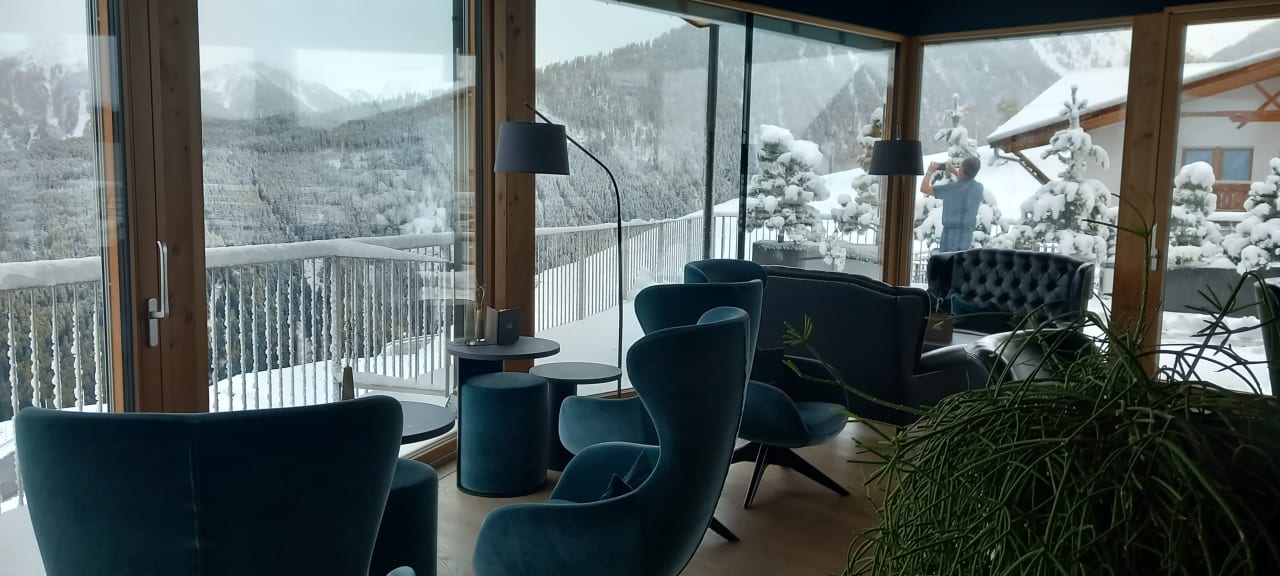 Panorama Lounge mit Ausblick ins Tal und auf die Berge