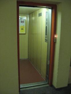 AufzugHier der schon etwas ältere Aufzug aus dem Jahre 1971, der vielleicht manchen Leuten, die nicht gerne mit älteren Aufzügen fahren, ein bisshen gruselig vorkommen wird. Zugegeben, manchmal dauert es wirklich etwas länger, besonders in den Zeiten, wenn es Frühstück und Abendbrot gibt oder wenn viele Menschen anreisen (nach 16:00 Uhr). Außerhalb der Stoßzeiten ist er aber eigentlich immer sehr schnell da.