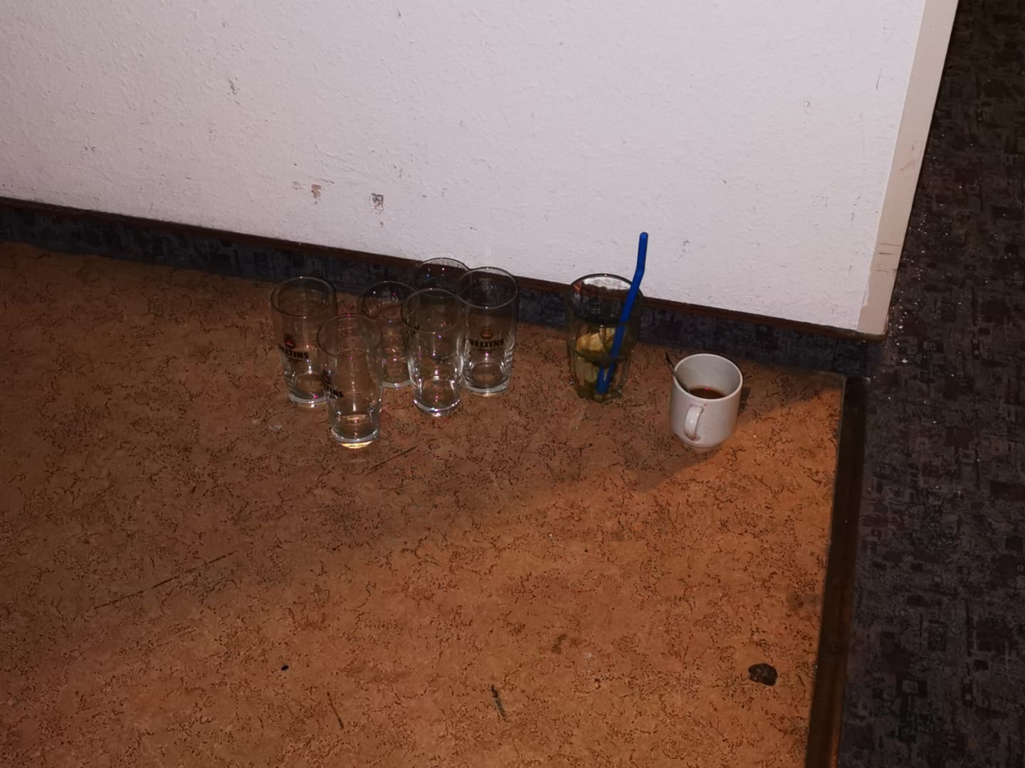benutzte Gläser mitten auf dem Flurboden.