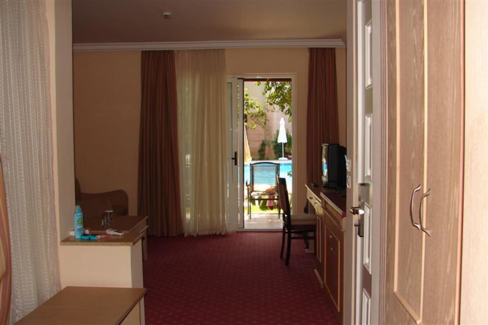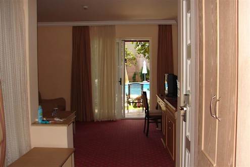 Wohnzimmer Bild zeigt den Blick vom Wohnzimmer unserer " Select Villa" auf die Terrasse und den davor liegenden Pool.