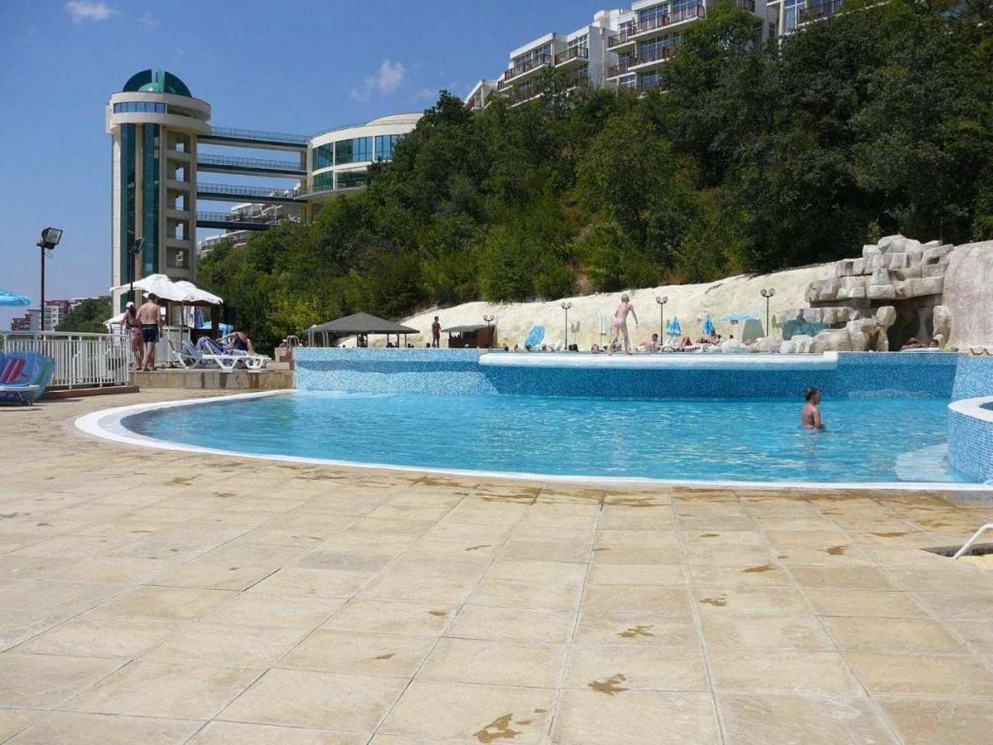 Base z hotelem w tle