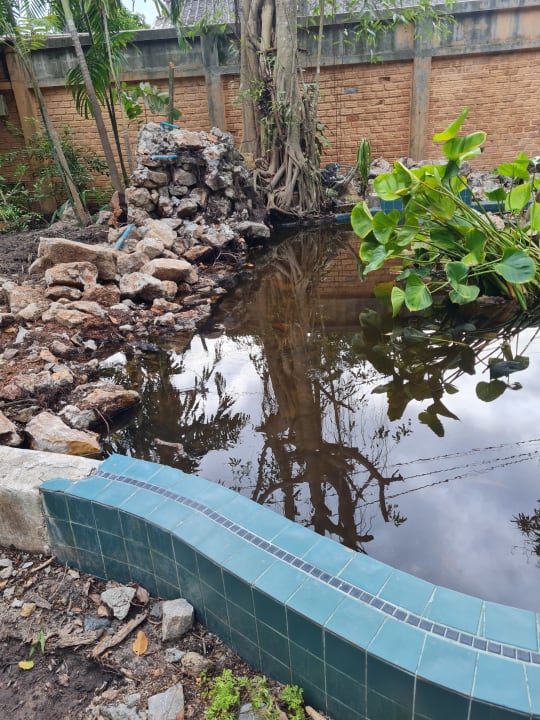 Mauer völlig eingestürzt, Wasser brackig und perfekte Brutstätte für Insekten