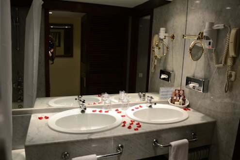 BadezimmerBadezimmer mit großem Spiegel, Föhn und Kosmetikspiegel. Deko beim ersten Tag.