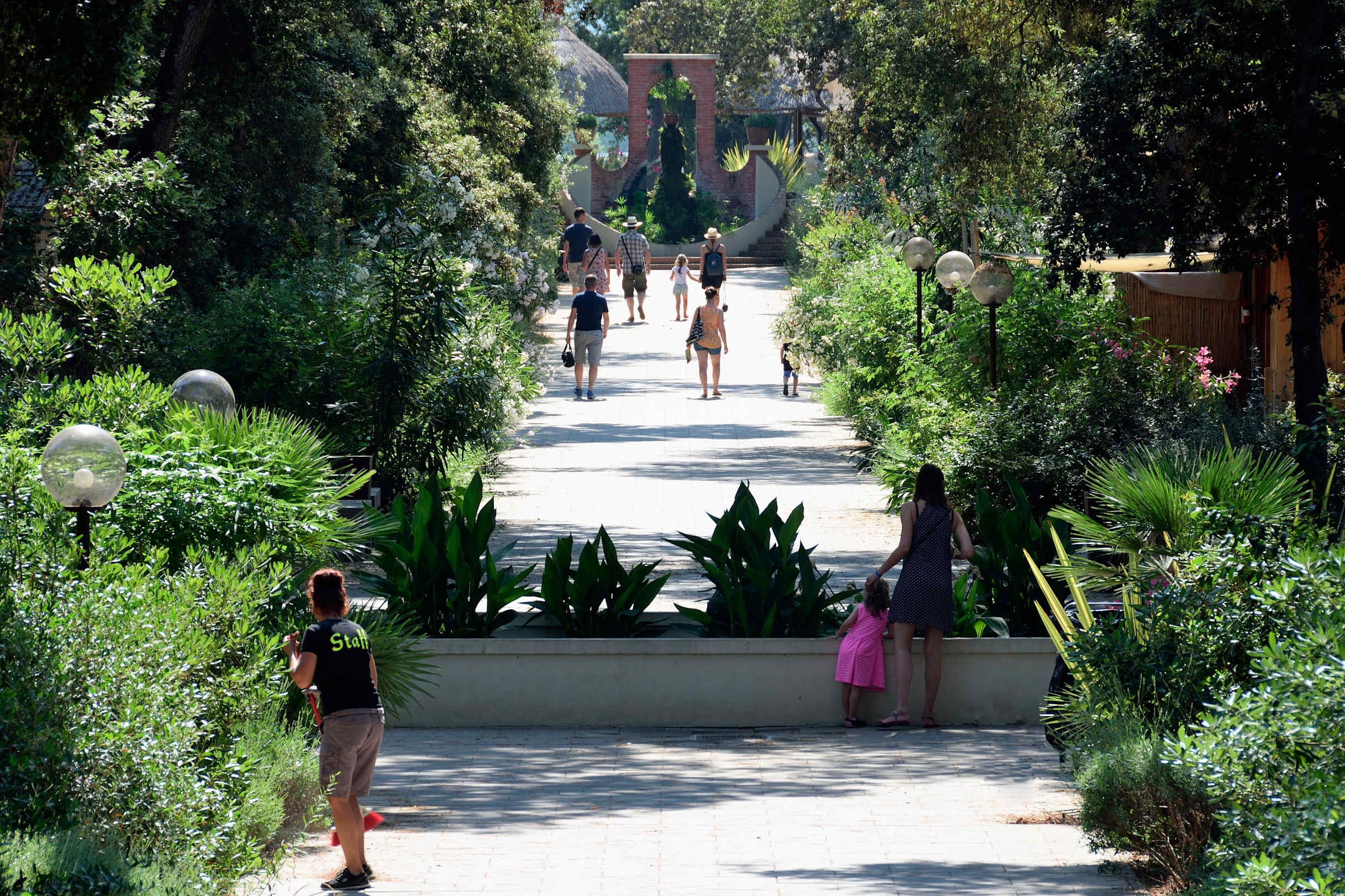 Blick auf die Hauptpromenade von der Rezeption zum Pool. Im Hintergrund die Rezeption.
