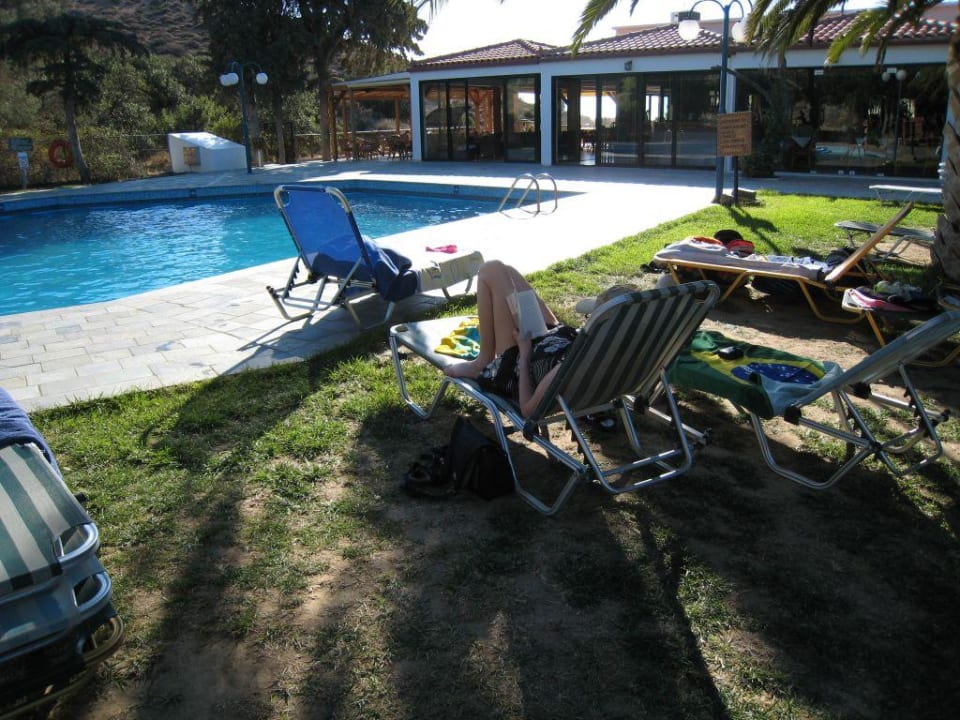Pool im Irini MarePoolbereich ist ausreichend groß und mit schattigen Palmen sehr angenehm. Im Hintergrund das Hotelrestaurant.