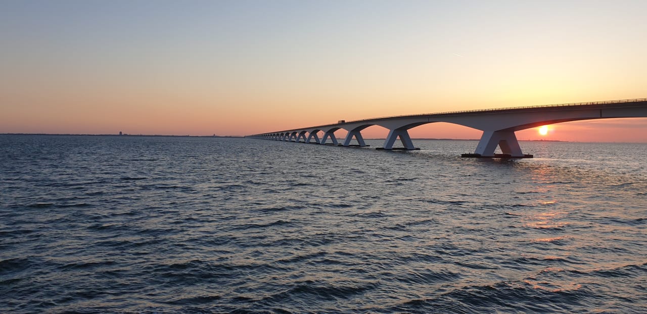 Sonnenaufgang über der Oosterschelde an der Zeelandbrücke
