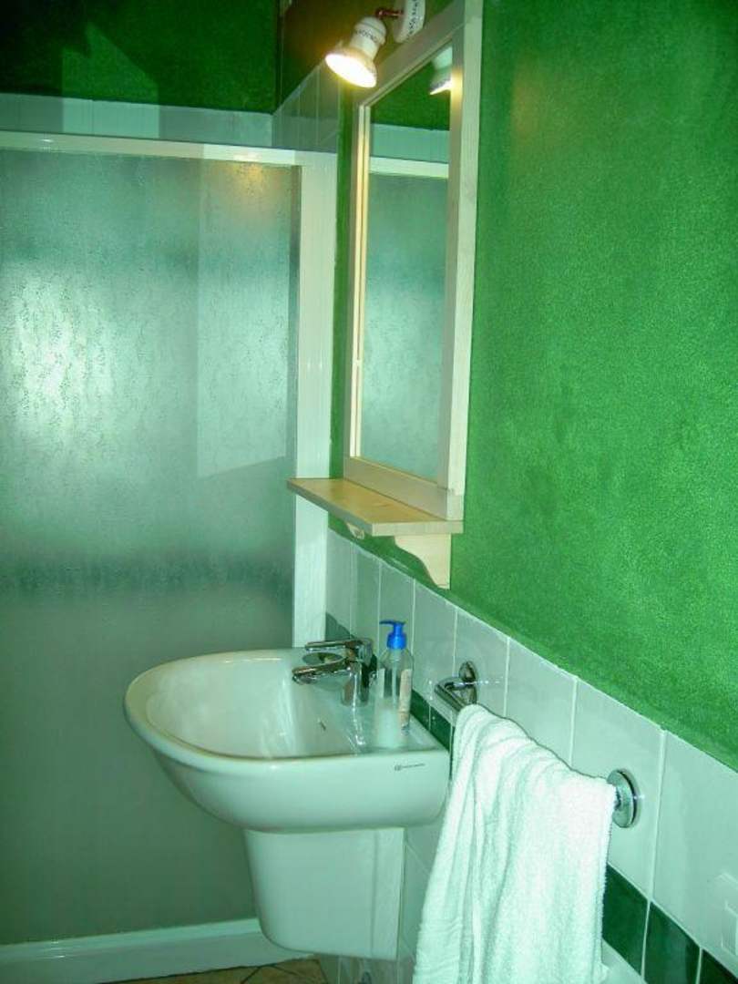 Appartment Eden - Badezimmerunter dem Spiegel einzige Ablagefläche im ganzen Badezimmer + 1 Handtuchstange für 4 Personen