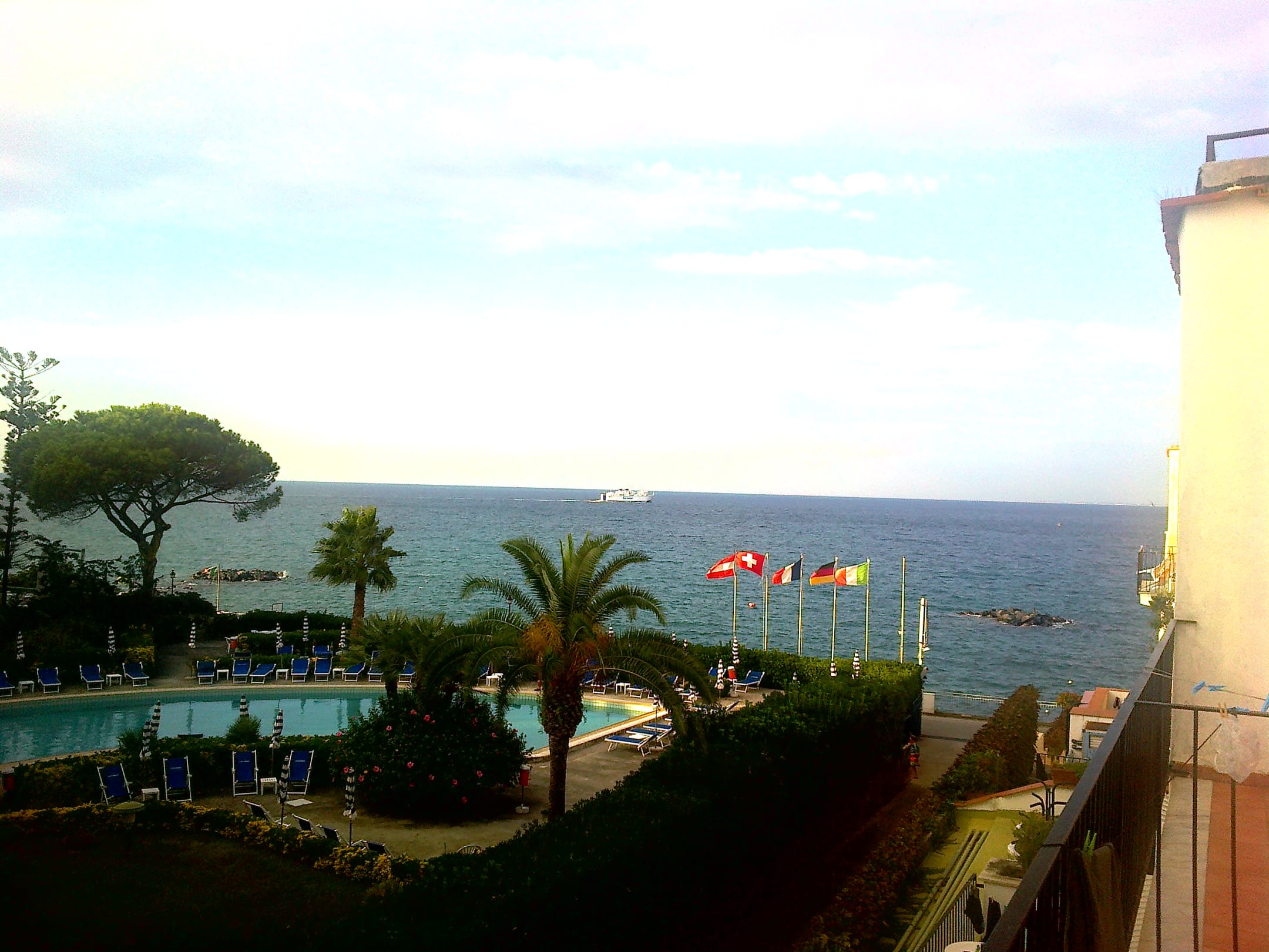 Ausblick vom Zimmer # 424 auf den Pool des Nachbarhotels sowie westliches Meer