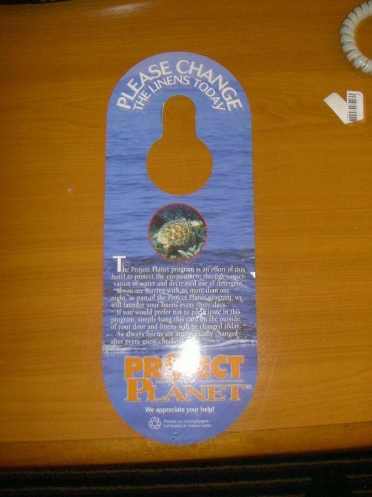 Normal wird die Bettwäsche alle 3 Tage gewechselt. Um Reinigungskosten zu sparen und die Umwelt zu schonen. Wer diese Karte vors Zimmer raushängt kann seine Bettwäsche täglich gewechselt haben