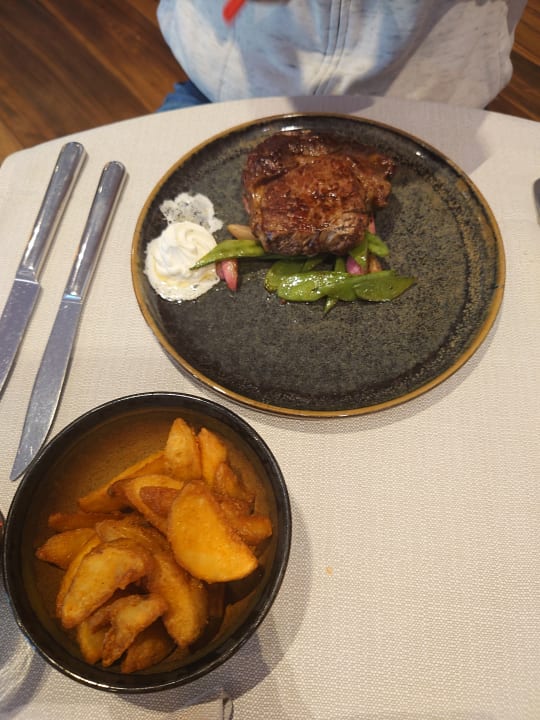 GastroEntrecote Steak mit Zuckerschoten und Radieschen, dazu Potato Wedges