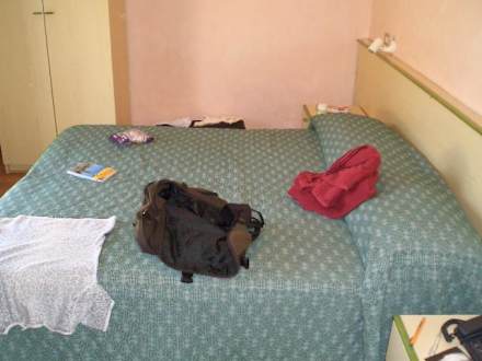 Das Zimmer besteht aus Bett, die Schranktür grenzt direkt an der Matratze, am Fußende befindet sich bereits die Balkontür. Foto wurde aus dem Eingang gemacht.