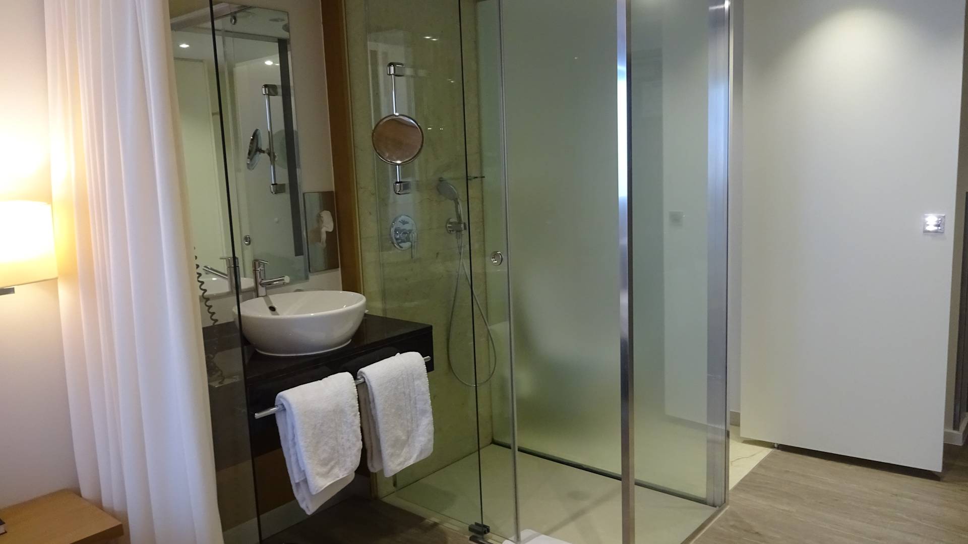 Waschbecken und Dusche können durch einen Vorhang abgetrennt werden