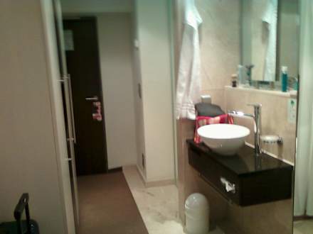 Eingangsbereich des ZimmersEingan durch das Bad. Hinter dem Waschbeckenspiegel liegt die gläserne Duschkabine.
