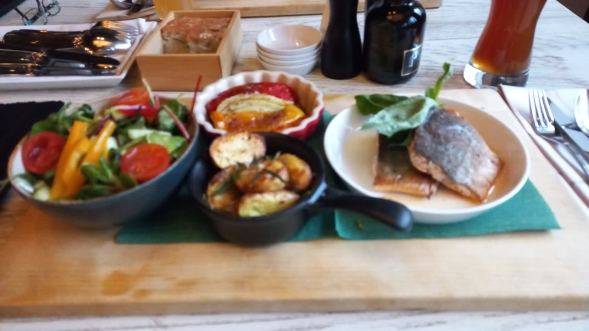 Saibling mit Ofengemüse Rosmarinkartoffeln und Salat