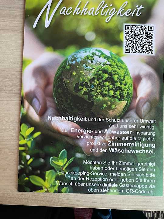 Mit der Ausrede von Nachhaltigkeit und Umweltschutz werden die Zimmer nicht gereinigt. Höchst unhygienisch und unsozial gegenüber dem Personal! Nicht zu empfehlen!