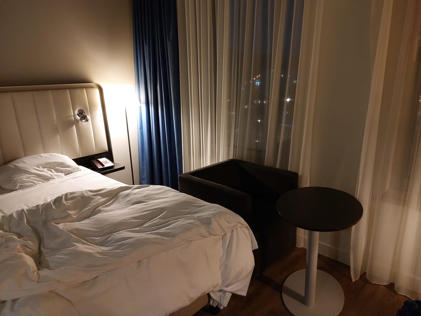 Ein grosser Sessel mit Tisch direkt im Zugang zum Bett. Diekt vor dem Bett ist der Schreibtisch, somit hätte man den Sessel schlecht aus der Ecke rausziehen können ohne den Platz vor dem Bett zu blockieren.