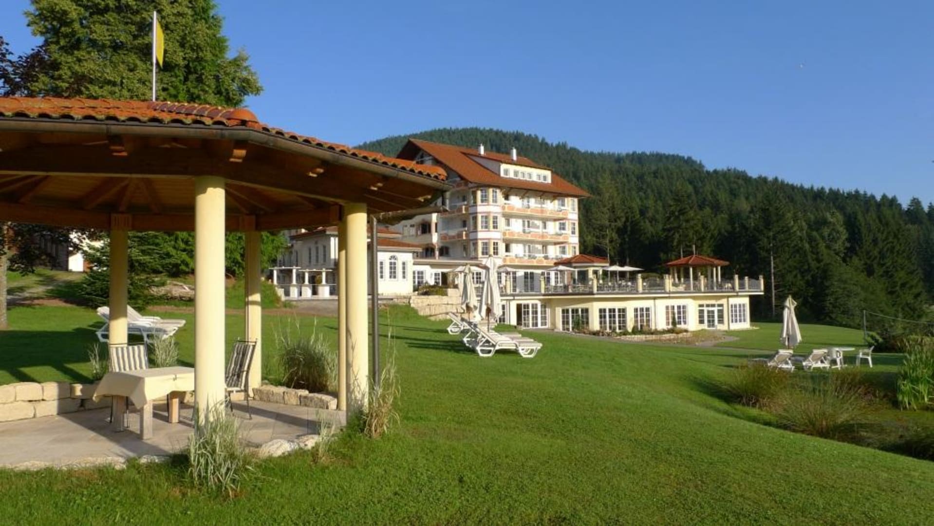 Blick auf den Ailwaldhof vom großzügigen Garten