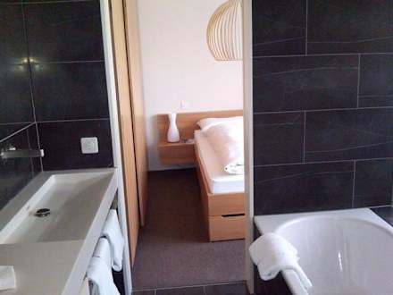 Tolles BadDie Badewanne und der moderne Doppel-Waschtisch stehen als halb- offene Komposition im Raum zwischen Wohn- und Schlafbereich. Es kann mit Schiebetüren abgetrennt werden. Ein "normaler" geschlossener Dusch/WC-Bereich steht zusätzlich zur Verfügung.