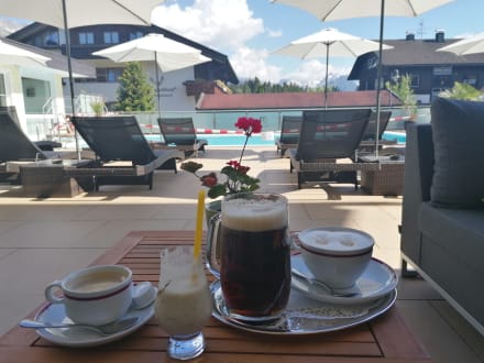 Kaffee auf der Außenterrasse. Im Hintergrund der noch gesperrte Außenpool.