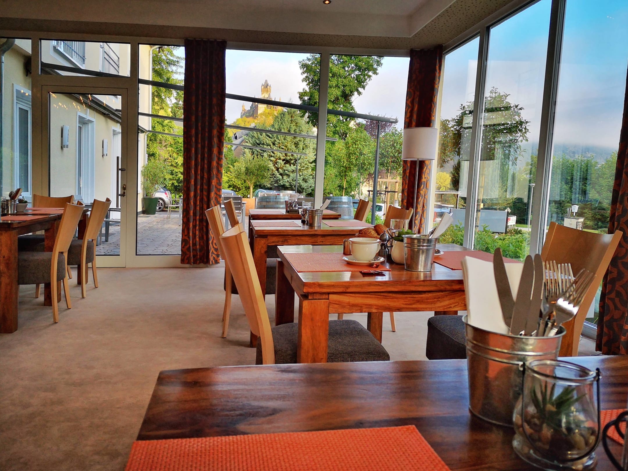 Morgendlicher Blick aus dem Restaurant in Richtung Reichsburg Cochem
