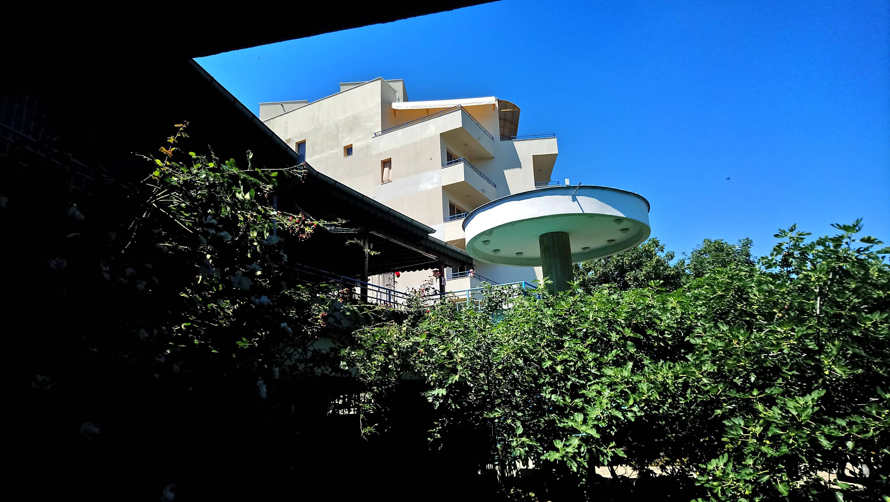 Links oben das Restaurant über die Wendeltreppe. Auf der anderen Seite auch mit vielen Stufen