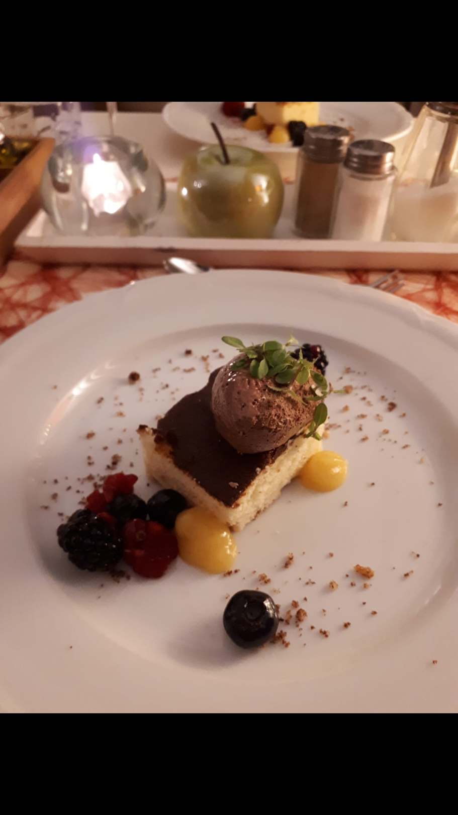 Weiße Schokoladentarte Schokomousse/mazerierte Beeren/Mango