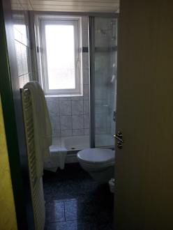 Weiter konnte man die Badezimmertüre nicht öffnen. Das Bild zeigt die volle Breite des Bads. Hinter der Tür versteckt ist das Waschbecken.