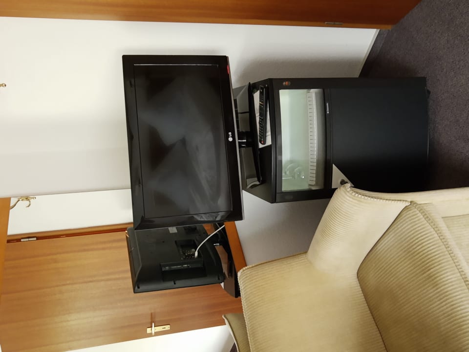 Unter dem TV-Gerät befindet sich ein kleiner Kühlschrank (Minibar)