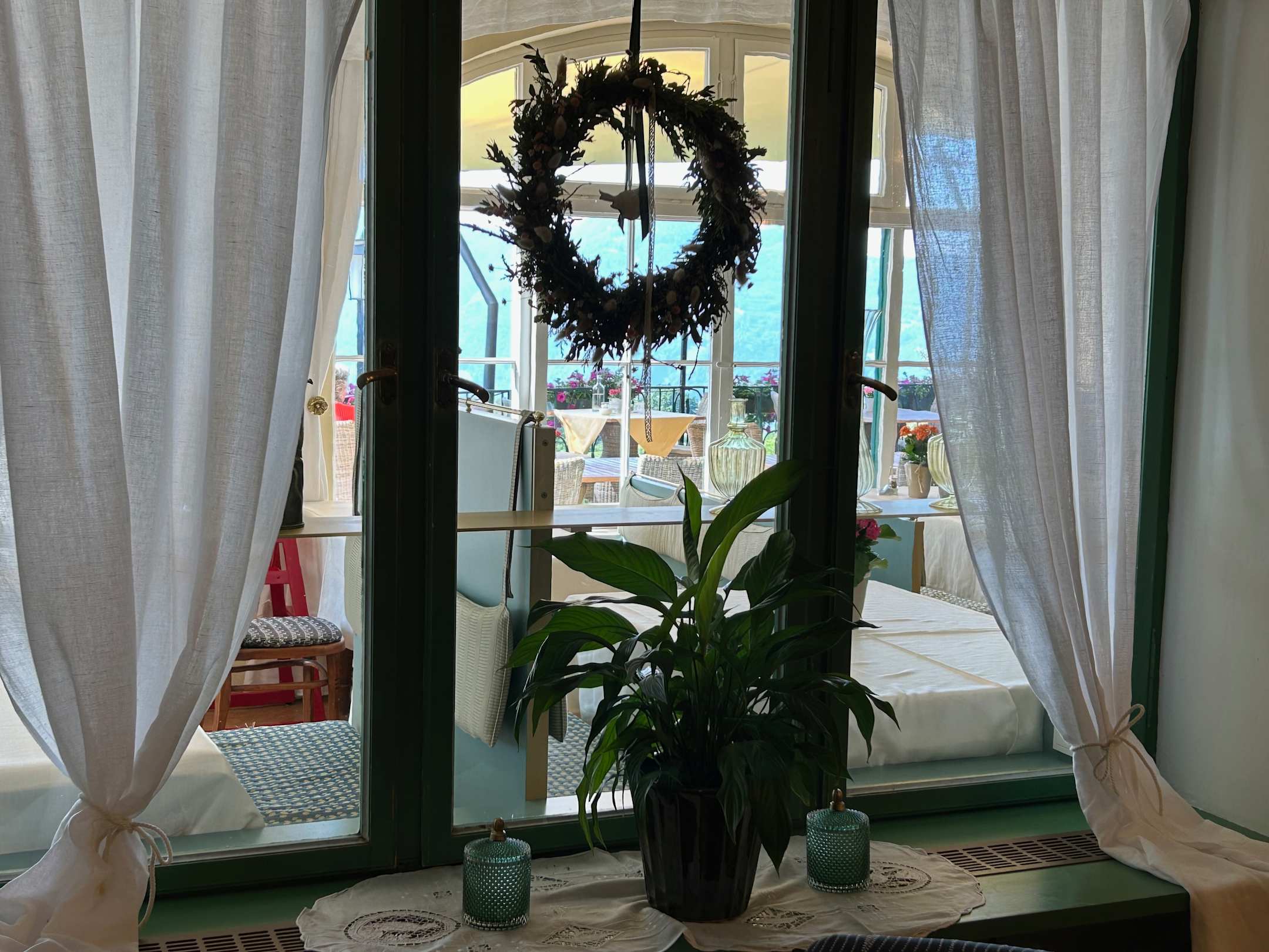 Durchblick von der Bar über einen Teil des Speisesaals auf die Terrasse.