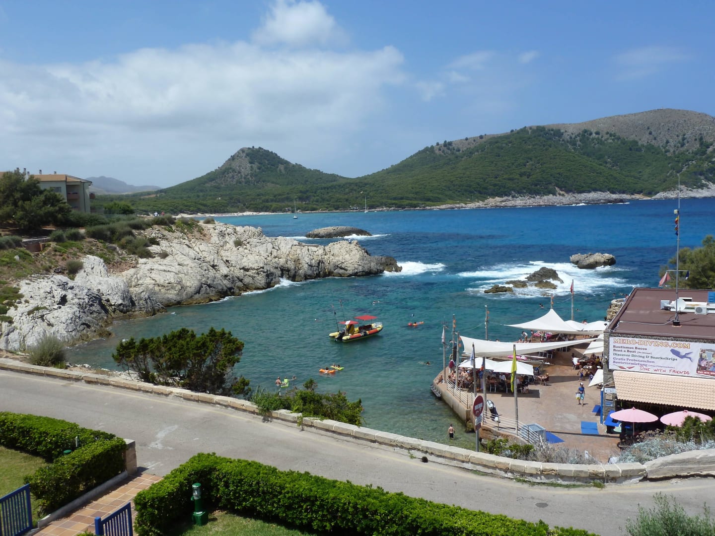 Blick über die Bucht mit Tauchschule und Bar