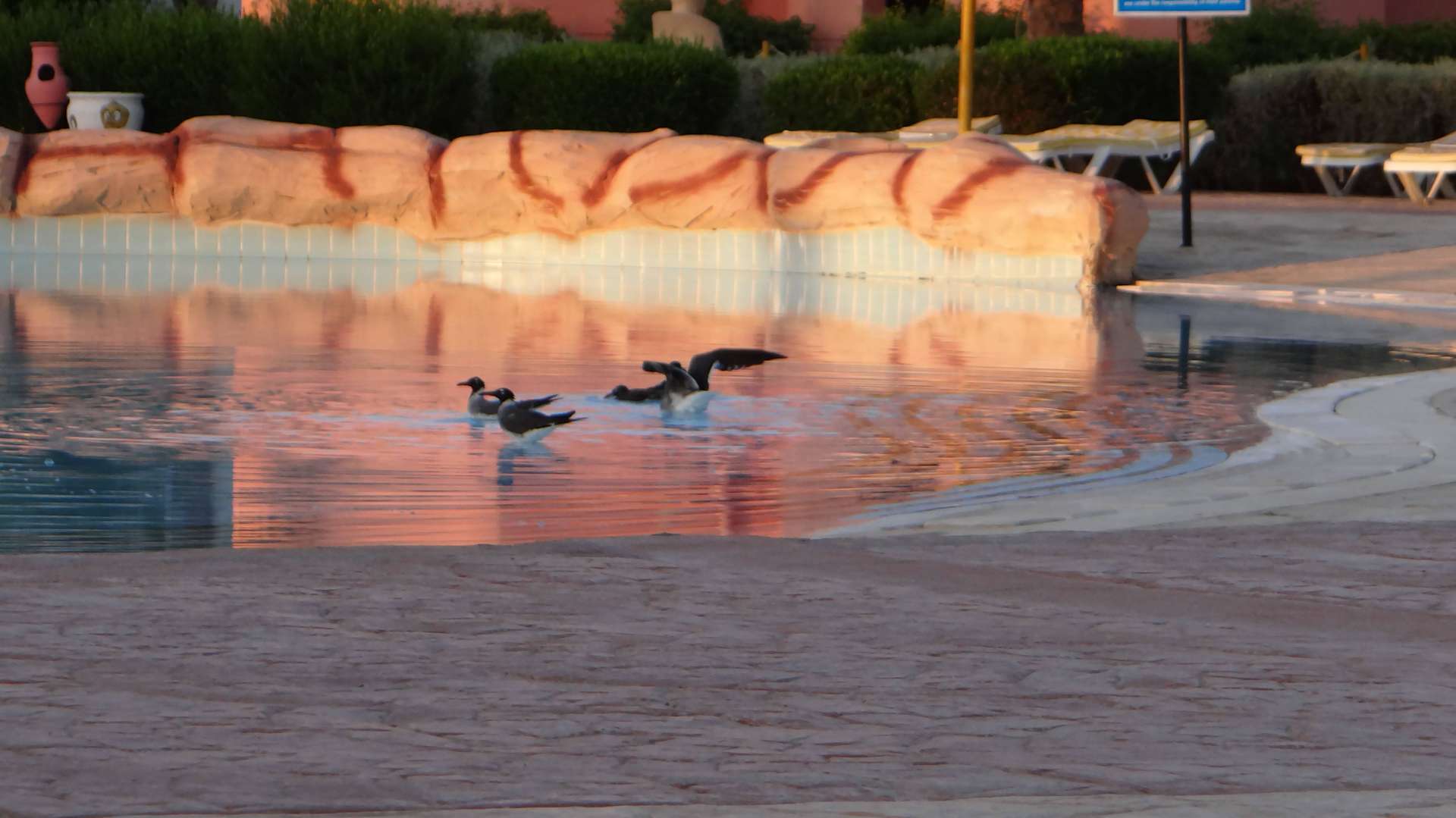 Basen i ptaki które się w nim popołudniu kąpią