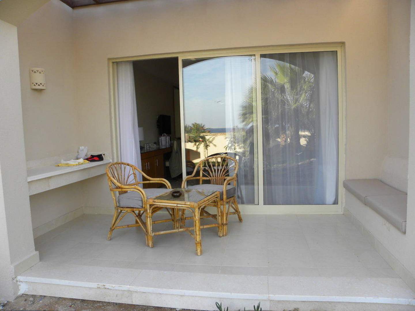 Bungalowterrassezur Not kann man auf dem Bänkchen rechts auch ein Mittagsschläfchen halten