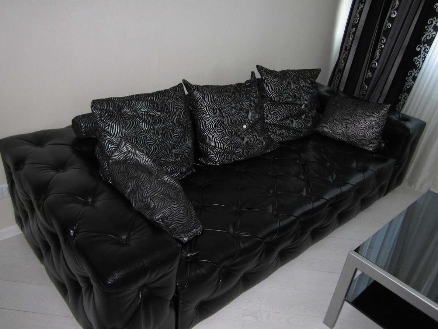 Großes Sofa aus schwarzem Leder (oder Kunstleder). Als Rückenteil mehrere, gepolsterte Stoffkissen (Bezug Schwarz/Silbernes Zebramuster). Vor dem Sofa ein kleiner Glastisch.