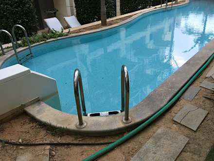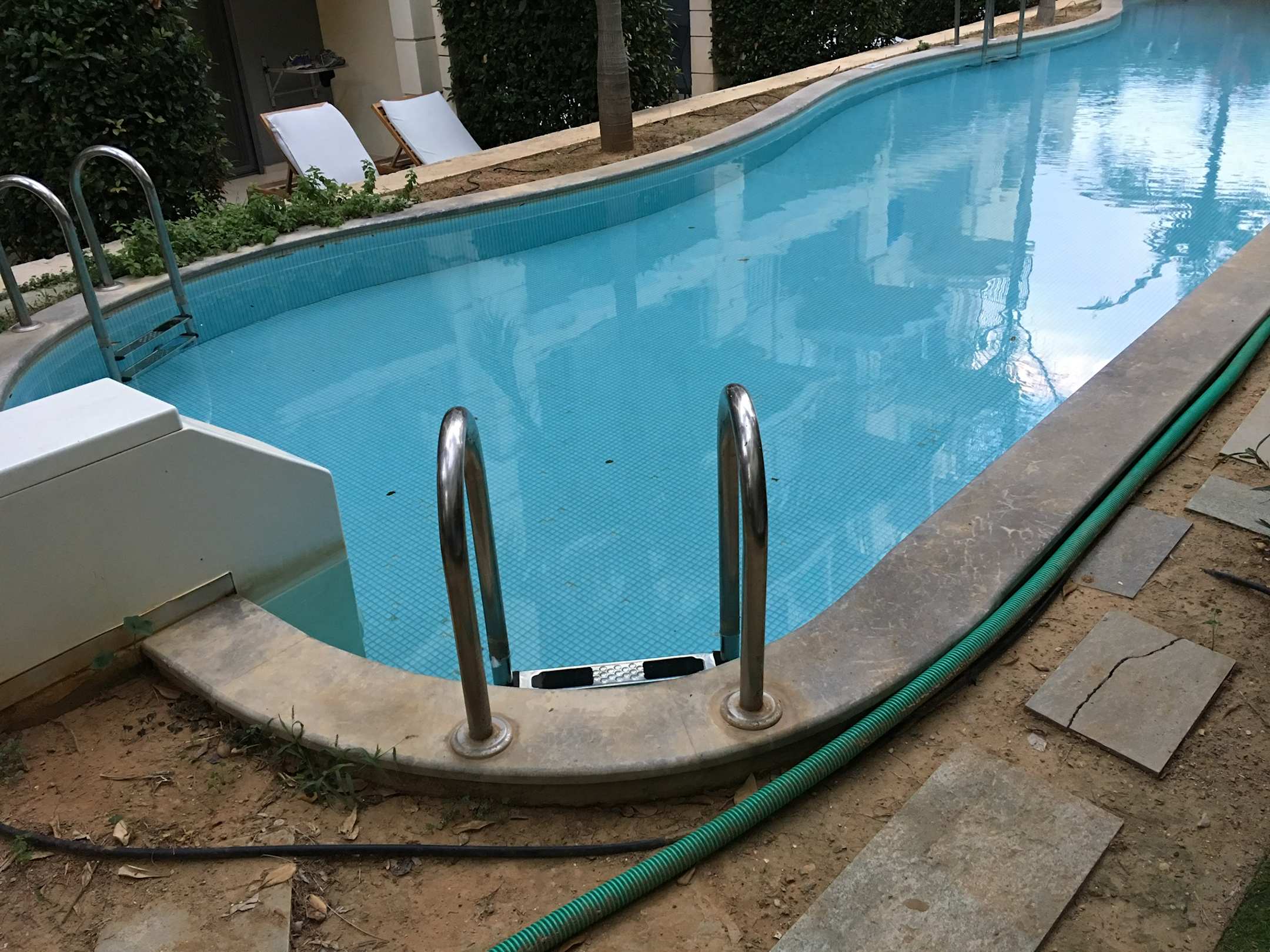 PoolPrivatpool. Wurde anscheinend nicht sauber gemacht. Daneben dekorative Schläuche und Kabel.