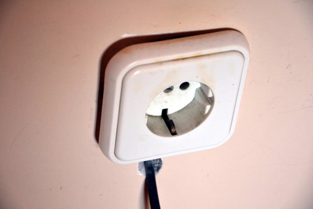 Zimmer 308Eine Zumutung, nur eingesteckte, nicht verschraubte Steckdose, Kabel umwickelt mit Isolierband.