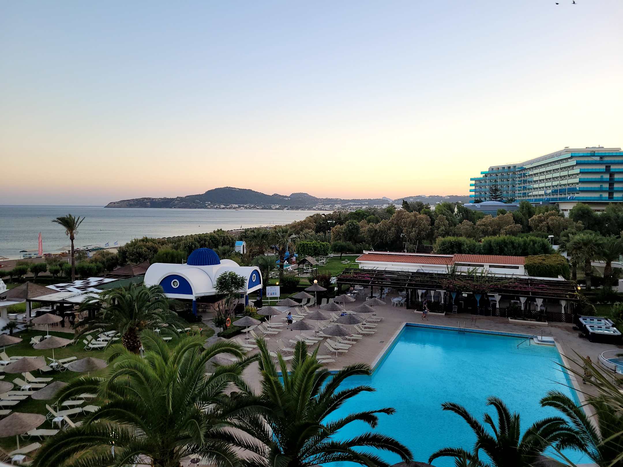AusblickAusblick vom Balkon Deluxe Zimmer, vorne der große Pool, links der Strand, hinten die Rutsche, in der Mitte Bar und a-la-Carte-Restaurant