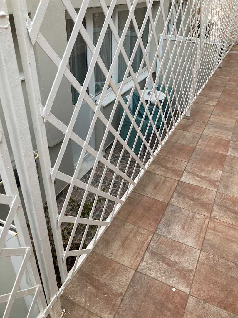 Winzige Terrasse direkt am Durchgang. Handtuchhalter defekt, keine Möglichkeit, Handtücher aufzuhängen