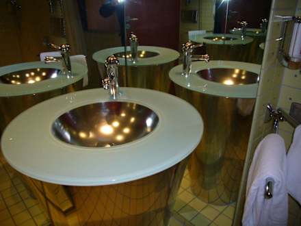 BadDesigner-Waschbecker vor Spiegelwand