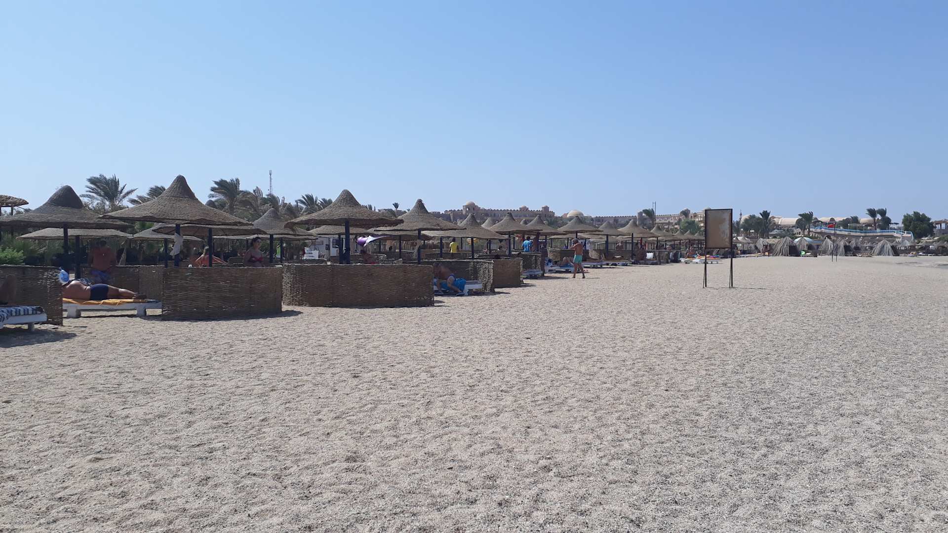 Strand ist sehr groß,nur ein kleinerer Teil ist zum Baden für Kinder und Nichtschwimmer eingegrenzt.Es ist wegen Verletzungsgefahr durch Korallen notwendig.