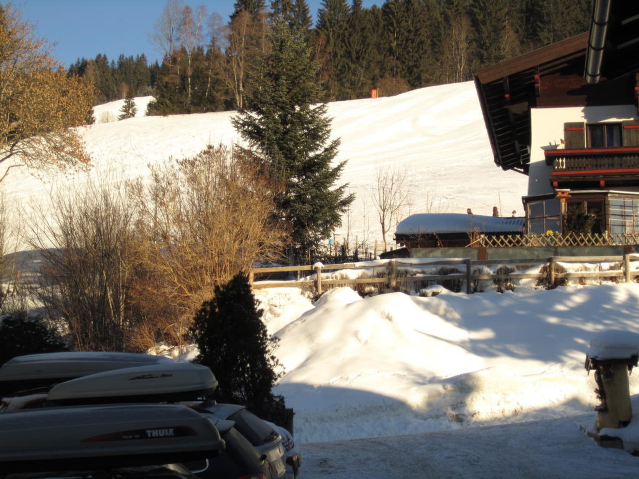 Blick vom Balkon über die Strasse zur Piste