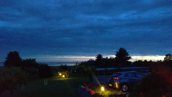Blick in den Garten bei Dämmerung