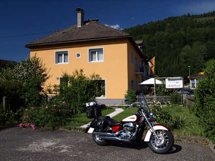 Auf unser Fahrt mit dem Motorrad nach Kroatien Dieses Foto wurde vor der Pension Adelheid in Gmünd-Kärnten aufgenommen.Auf dem hauseigenen Parkplatz konnten wir unser Motorrad gut und sicher abstellen.Bei sehr schönen Wetter haben wir dieses Foto am Morgen gemacht.Die Pension liegt direkt an der Strasse und ist mit jeden Fahrzeug leicht zu erreichen.