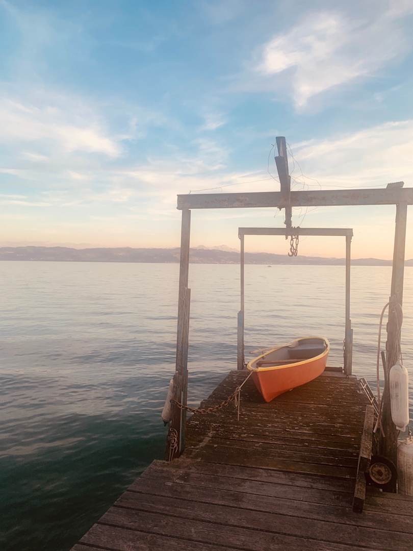 Nostalgischer Steg mit kleinem Ruderboot