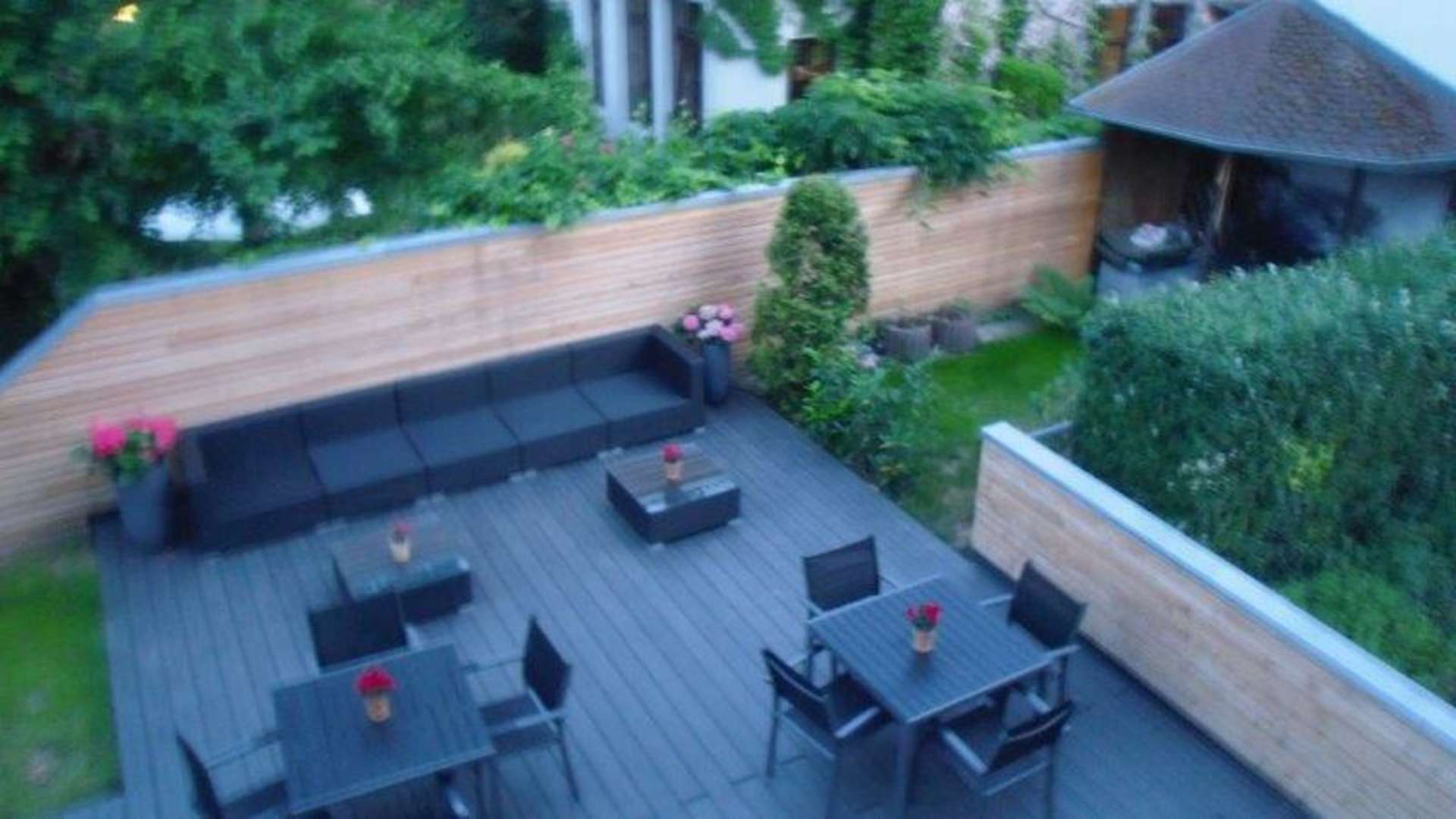 Blick auf die Sitzgruppe im Garten von meinem Zimmer