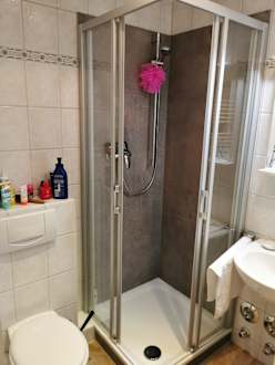 sehr kleines Bad, kleine Dusche, keine Ablage in der Dusche